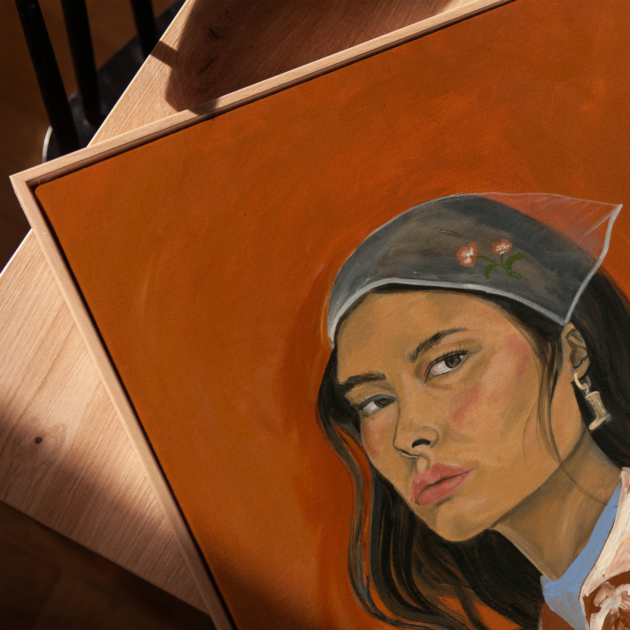 “Cowgirl with the Golden Boots” canvas print features a close-up portrait of a woman set against a warm orange background. She is shown in three-quarter profile, looking off to the side with a calm, focused expression. She wears a soft headscarf with small floral details, a cow-hide jacket layered over a pale blue top, and statement earrings: golden boots.