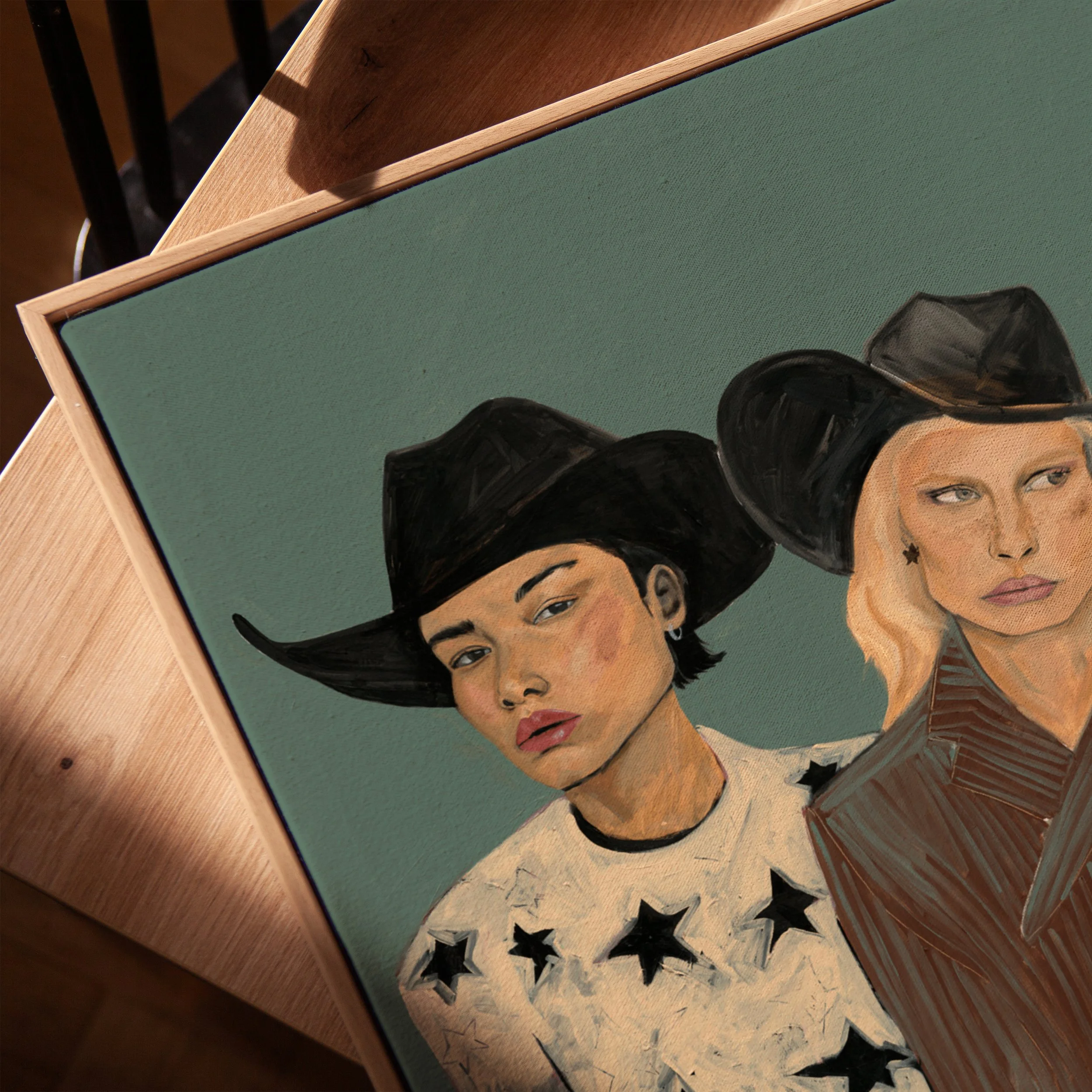 “Midnight Cowgirls” depicts two women standing shoulder to shoulder against a muted green background. Both wear black cowboy hats and look off in opposite directions, their expressions calm and self-possessed. The figure on the left wears a light yellow shirt patterned with black stars, short dark hair visible beneath the hat. The figure on the right has long blonde hair and wears a brown velvet jacket with fine vertical lines, she has tiny black star earrings in.