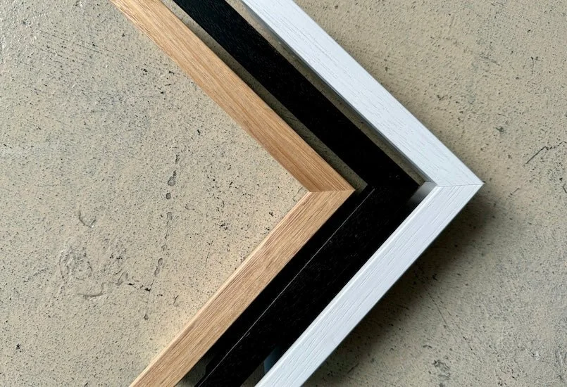 Canvas prints are framed in a Float Frames. They are sourced locally from FSC-certified suppliers and are available in a range of finishes. They are 10mm wide on the face and 55mm deep, and we fit them with a 5mm space between the canvas and the frame, to create a shadow line.